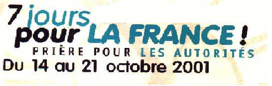 Pour plus d'information, demandez le dossier "7 jours pour la France" dans votre Église ou directement à la F.E.F. B.P. 89 - 77330 OZOIR-LA-FERRIERE (5 F / pièce).
