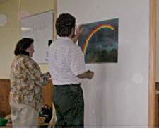 Nous étions issus de diverses paroisses de l'EEM et nous nous sommes retrouvés à Landersen le jeudi 29 mai 2003 (Ascension) pour passer ensemble cette journée organisée par l'EEM de Strasbourg-Sion.Celle-ci a commencé par un culte. Au cours du moment de louange animé par quelques jeunes talents, nous avons notamment chanté le chant « Chante Alléluia au Seigneur » en diverses langues, dont le coréen. La prédication a été apportée par six personnes qui ont essayé d'imaginer quels pouvaient être les sentiments des disciples après l'ascension de Jésus : le doute ou la confiance, la peur ou la joie, le découragement ou l'espérance. Les gens de l'assemblée qui le souhaitaient ont pu alors s'avancer vers un tableau représentant un ciel sombre traversé par un arc-en-ciel et y coller le long de l'arc des vignettes de couleur, représentant leur(s) sentiment(s). Les deux « couleurs » majoritaires que vous voyez ressortir sur la photo représentaient la confiance et l'espérance, la joie arrivant en troisième position.