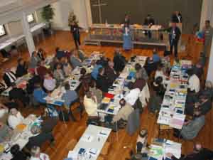 La Sainte Cène, prise à la fin de ce culte, était le signe visible de cette foi commune en l'amour divin qui libère et qui unit.Le jour suivant, l'Evêque a adressé son Message à la C.C., intitulé : « Une communauté vivante, parce que Dieu aime la vie ».Ce message, dense et profond, est centré sur l'esprit communautaire, à une époque où l'individualisme et le particularisme se répandent de plus en plus. Le texte complet en est disponible sur Internet (http://www.umc-europe.org/admin/documents/619978fe16d0eb25958b23641151428a.doc),ou, sous forme de brochure, au secrétariat de l'Evêque à Zurich (CH8026), BP N° 2239. J'en citerai simplement quelques idées et extraits :- Ne faudrait-il pas, au lieu de grandes « églises-centres de prestations de service » disposant de ministères spécialisés, viser plutôt la multiplication de « communautés de base », plus petites, conduites par des laïques bien formés et accompagnées par des pasteurs ordonnés itinérants ?- « La famille est malade, à l'Est comme à l’Ouest