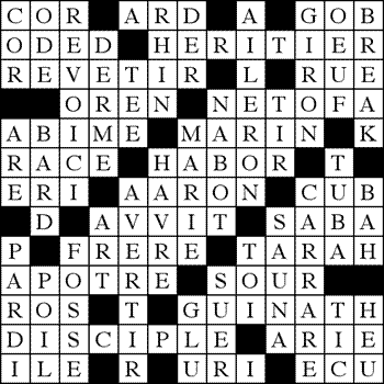 1. Travesti masculin vêtu de manière recherchée et exubérante — 13. Gâteau composé de pâte à biscuit fourrée d’une crème au beurre parfumée au café (ou au chocolat) — 7. Loth était celui d’Abraham (Gn 11.31) — 2. Graminée appelée aussi « élyme » des sables, employée à fixer les sables des dunes — 14. Allure naturelle du cheval, intermédiaire entre le pas et le galop — 11. Argent — 3. Ensemble de cinq cents feuilles ou vingt mains de papier — 15. Terme péjoratif pour désigner un Nord-africain établi en France — 12. Partie molle à l’intérieur du pain — 4. Mammifère carnassier d’Amérique (félidés), arboricole, à pelage fauve et sans crinière — 16. Le terme de Seigneur dans la langue de Shakespeare — 9. Livré au plus offrant — 5. Israël divague du nord à l’orient (Am 8.12) - 17. Logis considéré sous son aspect intime et familial