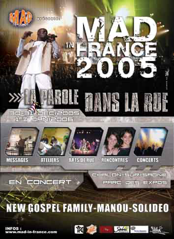 Du 30 décembre 2005 au 1er janvier 2006, à Chalon-sur-Saône, 3 jours mixés de sensations fortes, shows et rencontres authentiques entre nous et notre créateur pour le jour de l’an. Imagine des centaines de jeunes de France, de Suisse et de Belgique rassemblés dans un décor de rue. Des concerts avec New Gospel Family, Manou et Solidéo. Du gros show : Battle de break danse, du street, du graff et sports extrêmes Des orateurs au message puissant pour amener la parole dans la rue. Des ateliers de réflexion sur des thèmes d'actualité. Mad in France 2005 va faire bouger les choses. Fiche d’inscription et plus d’infos sur www.mad-in-france.com
