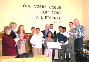 Que c’est bienfaisant d’y retrouver les différentes tranches d’âge, quoique nous aimerions voir plus celle des 15-25 ans… Suivant les disponibilités de chacun, nous avons deux études bibliques et trois réunions de prière en semaine. Pour le culte, nous nous retrouvons de 50 à 70 ; plusieurs y participent, autant pour la première partie (les jeunes couples en particulier prennent une part active, tout en se partageant la tâche de la garderie) que pour le message ; et cela avec le soutien de plusieurs musiciens et de temps en temps de la chorale qui essaie de répéter chaque semaine (pour le plaisir de chanter avant tout !).