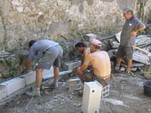 Tour à tour conducteur d’engins, géomètre, maçon, camionneur, charpentier, couvreur… Et même charcutier traiteur lorsqu’il s’est agi de régaler la troupe lors de la pause, Yves, notre increvable chef de chantier, a employé les multiples facettes de son talent. À sa suite, chacun a fait de son mieux pour apporter au travail d’équipe son savoir faire ou son coup d’œil et de main. Mais quand il a fallu tirer le béton dans les quelque 50 mètres de tranchées inaccessibles depuis la goulotte du camion, tous les bras furent réquisitionnés, et il aura fallu le renfort de nos dames pour mener l’ouvrage à bien. Ce sont elles également qui ont pris soin de nos solides appétits en rivalisant d’attentions pour soutenir le moral de l’équipe !