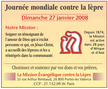 La Mission Evangélique contre la Lèpre s’adresse particulièrement aux Chrétiens et aux Eglises protestantes et Evangéliques. Plus que jamais, elle a besoin de leur soutien par la prière et par les dons. Aussi, à l’occasion de la Journée Mondiale de la Lèpre, le 27 janvier prochain, - et tout au long de l’année – soutenir son Action, c’est un geste de solidarité qui permet de redonner du sens à la vie de milliers de personnes, de changer le regard et l’attitude de la société sur l’exclusion et la misère.