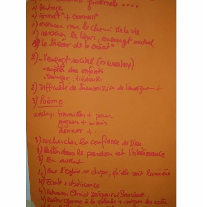 Le samedi après midi, nous avons pu donner libre cours à notre imagination. Nous avons été invités à nous demander quel rêve, quelle vision nous avons pour notre église. Certains ont rêvé d’une église qui se laisserait interpeller par les besoins des déshérités et des laissés pour compte, et qui, comme les premières églises méthodistes, accepterait de se mettre en marche pour y répondre.
