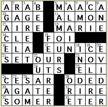 1. Jésus était pour plusieurs objet de scandale, obstacle qui les empêche de réussir (Mt 13.57 ; Mc 6.3) - 7. Dieu le leur a mélangé pour les empêcher de se comprendre entre eux (Gn 11.7) - 8. Chez les Hébreux, mesure de capacité pour les liquides; sa contenance, moindre à l'origine, varia de 5 à 6 litres - 9. Avance de fonds, ou d'autre chose. Primitivement, les Israélites sollicitant un prêt ne demandaient pas de l'argent, mais des choses de première nécessité. La Loi ordonnait de secourir l'indigent (Dt 15.7-11) - 11. Disciple de Jérusalem qui, avec sa femme Saphira, vendit une parcelle de terrain et en mit une partie du prix aux pieds des apôtres (Ac 5.1) - 13. Le beau-père de Moïse (Ex 2.18) - 14. L'organe des sens qui est le plus en liaison avec le monde extérieur et en transmet les données à l'homme intérieur, et souvent le coeur (siège de la volonté) suit les yeux (Jb 31.7) - 16. Récipient creux. Mesure hébr. de capacité pour les matières sèches ou les liquides - 17. Admettre une personne dans la position et dans les privilèges d'un enfant légitime (gr. huiothesia = placer comme fils, considérer comme tel, l'établir en cette qualité). Dans l'antiquité, gén. seul un garçon ou un homme était adopté (comme successeur ou héritier), Esther est une exception - 19. Livre et auteur se nomment Qohéleth, un nom qui peut signifier: le Chef de l'assemblée (du peuple? des sages?). Puisqu'il se dit aussi fils de David qui a régné à Jérusalem, la tradition a attribué ce livre à Salomon.