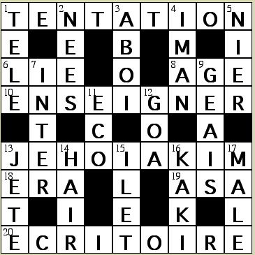 1. Numéral ordinal Premier - 2. Plante officinale au goût âcre et amer. Les Pharisiens, par excès de zèle, la soumettaient à la dîme (Lc 11.42) - 3. Pronom réfléchi de la troisième personne - 4. Métal précieux; dans l'antiquité, on en extrayait au pays d'Havila (Gn 2.11, 12) - 6. En Russie, sous les Tsars, communauté rurale ayant des terres en propriété collective - 8. Garçon d’écurie soignant les chevaux de course - 10. Dialogue entre deux personnes - 11. Symbole du germanium - 12. Symbole de l’aluminium - 14. Symbole du zinc.