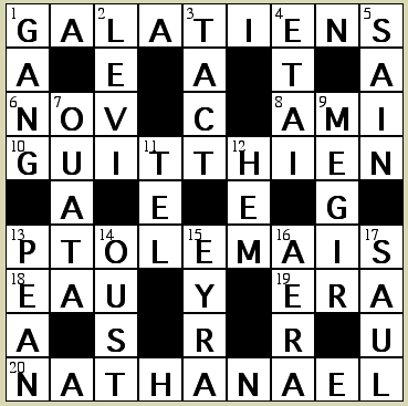 1. Serviteur de Gédéon, sans doute son porteur d'armes (Jg 7.10, 11) - 5. Descendant d'Ephraïm (1Ch 7.20) - 10. Homme de la famille d'Ezéchias, 98 de ses descendants revinrent de la captivité de Babylone (Esd 2.16; Né 7.21) - 11. Chrétien de Corinthe, baptisé par Paul; renommé pour son hospitalité envers les chrétiens (Rm 16.23; 1Co 1.14) - 12. Les navigateurs s’en servaient aussi (Ac 27.40) - 13. Comment l’Ecclésiaste a trouvé la femme qui est un piège, dont le cœur est un filet et dont les mains sont des liens (Ec 7,26) - 14. Homme de la tribu d'Aser (1Ch 7.38) - 15. Région maritime, formant même partie d'un continent; la côte de la Palestine et de la Phénicie (Es 20.6) - 16. C'est là qu'Ahazia, roi de Juda, fut frappé par ordre de Jéhu et mortellement blessé (2R 9.27) - 17. L'un de ceux qui revinrent de la captivité avec Zorobabel (Esd 2.2) - 21. L'un des chefs des sacrificateurs qui revinrent de Babylone avec Zorobabel et l’auteur d’un livre biblique (Né 12.1) - 23. Père de Betsaleel, l'artiste (Ex 31.2) - 24. Quand il est avancé, il est regardé comme une bénédiction (Ex 20.12; Dt 5.16) - 25. Petite île qui se trouve entre Milet et Rhodes, séparée de Rhodes par une journée de navigation dans ce temps-là (Ac 21.1) - 26. Fils de Ruben, fondateur d'une famille patriarcale (Gn 46.9; Ex 6.14; Nb 26.6) - 29. Un des poids principaux chez les Juifs et dans l’Antiquité (grec mna, hébreu maneh, akkad. manou: dans ces 2 langues la racine signifie : compter; 1R 10.17) - 30. Prophète, fils d'Amots ayant vécu au 8e s. av. J.-C. Son nom, qui signifie «L'Eternel sauve» (ou «le salut est l'Eternel»), résume en partie le message de son livre - 31. Personne originaire de Médie, ou habitant ce pays (2R 17.6; Es 1.19; Es 13.17; Dn 5.28, 31) - 32. Le propriétaire de la colline que le roi Omri acheta pour bâtir Samarie (1R 16.24) - 33. Époques déterminées, d’où l’on commence à compter les années d’une nation.