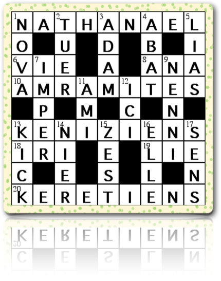 1. Musulman attaché à une mosquée et désigné pour diriger la prière - 2. Faire passer un chameau par celui d’une aiguille, c’est tenter quelque chose d’impossible ! - 3. Récipient cylindrique servant à puiser, à transporter de l’eau ou tout autre liquide - 4. Lampe du corps (Mt 6.22-23) - 5. Technique employée pour amorcer les virages en changeant de direction brutalement et en transférant le poids du corps d’un ski à l’autre, tout en gardant les skis parallèles - 7. Fils du frère ou de la sœur - 9. Petit mammifère de l’ordre des Rongeurs, très prolifique - 11. Interjection qui sert pour faire peur à qqn ou se moquer de lui - 12. Médecin, auteur de deux livres bibliques - 13. Partie de certains organes affectant une forme arrondie - 14. Chose ou objet qu’on ne nomme pas, machin - 15. Mouvement par lequel l’homme ou l’animal se lance en se détachant du sol, pour retomber sur place ou pour franchir un espace - 16. Logis considéré dans son aspect chaleureux et familier, dans lequel se retrouvent les membres de la famille - 17. Diminutif de moniteur.