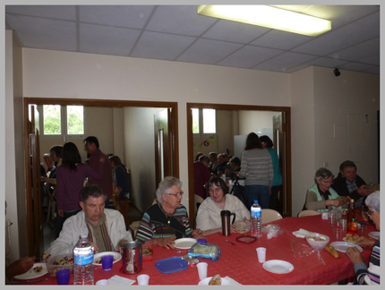 Même si la pluie nous a contraints à nous installer pour le repas à l’intérieur, on ressentait la chaleur, la fraternité, l’échange et le partage des plats et des conversations.