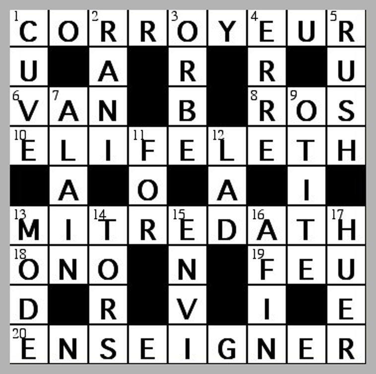 1. Délire de grandeur, surestimation de soi qui se rencontre chez les sujets dont le jugement est affaibli — 2. Petite éminence de terre ou de sable, petit socle fixé en terre, sur lesquels on pose la balle de golf afin de la frapper — 3. Ce que l’on fait des biens de ce monde (1Co 7.31) — 4. Casque enveloppant la tête et le visage, muni d’ouvertures pour les yeux que portaient les hommes d’armes au Moyen Âge — 5. Contenu et forme d’une oeuvre (poétique ou artistique) caractéristique du lyrisme — 6. En considérant les choses d’un point de vue humain — 10. Action de ressaisir, de rattraper quelque chose — 12. Ouverture pratiquée pour laisser passer les avirons — 15. Ensemble des caractères organiques, intellectuels, moraux, qui distinguent l’un de l’autre l’homme et la femme — 19. Jésus a bu la coupe de la colère divine jusque-là.