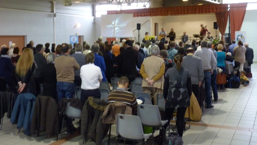 Après une nuit de repos, délégués et membres des églises méthodistes du secteur se retrouvent dans une même salle des fêtes de Codognan pour célébrer le culte. D’emblée, le pasteur Pascal Maurin accueille le Maire lequel salue l’assemblée par des paroles fort chaleureuses. Le groupe musical formé pour l’occasion entraîne l’assemblée dans la louange. En ce jour des Rameaux (Mt 21), le surintendant Étienne Rudolph la fera réfléchir sur la portée de la venue de Jésus-Christ. Adulé un jour, décrié l’autre jour, Jésus demeure toujours et encore signe de contradiction dans le monde, mais aussi chez ses disciples de toujours. « Inconstances, contradictions, paradoxes, ce n’est pas nouveau et nous le savons bien. Parfois, nous pouvons même en arriver à avoir le sentiment de marcher à côté de nous-mêmes, de vivre dans un personnage que les circonstances et nous-mêmes avons fabriqué pour tenter d’apprivoiser ces contradictions … ». Et de souligner la Bonne Nouvelle que, jusque dans nos contradictions, Dieu se rend présent en Jésus contre toute attente, et qu’en Lui nous pouvons trouver le chemin de la guérison et de la réconciliation, hors de nos contradictions.